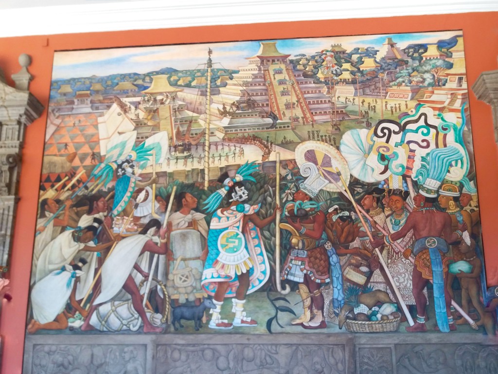Walking inside the building, you can also find other interesting paintings by Rivera that illustrated the life of the indigenous people of Mexico. For example, the one below shows the commercial trade between Mexican merchants and the Totonaca group, which carry crops of the regions like vanilla and tobacco, in front of the Pyramid of the Niches in Tajin, Veracruz.