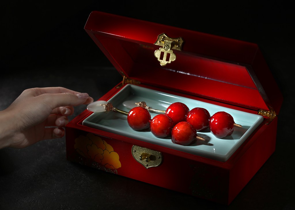 Our last course comes in an antique, elegant jewellery box, which houses a captivating dessert inspired by the traditional Northern Chinese candied hawthorn snack. Served on a skewer, this imaginative rendition replaces the hawthorn fruit with preserved plum mousse and substitutes the hawthorn jelly for the sugar syrup coating in the original recipe.