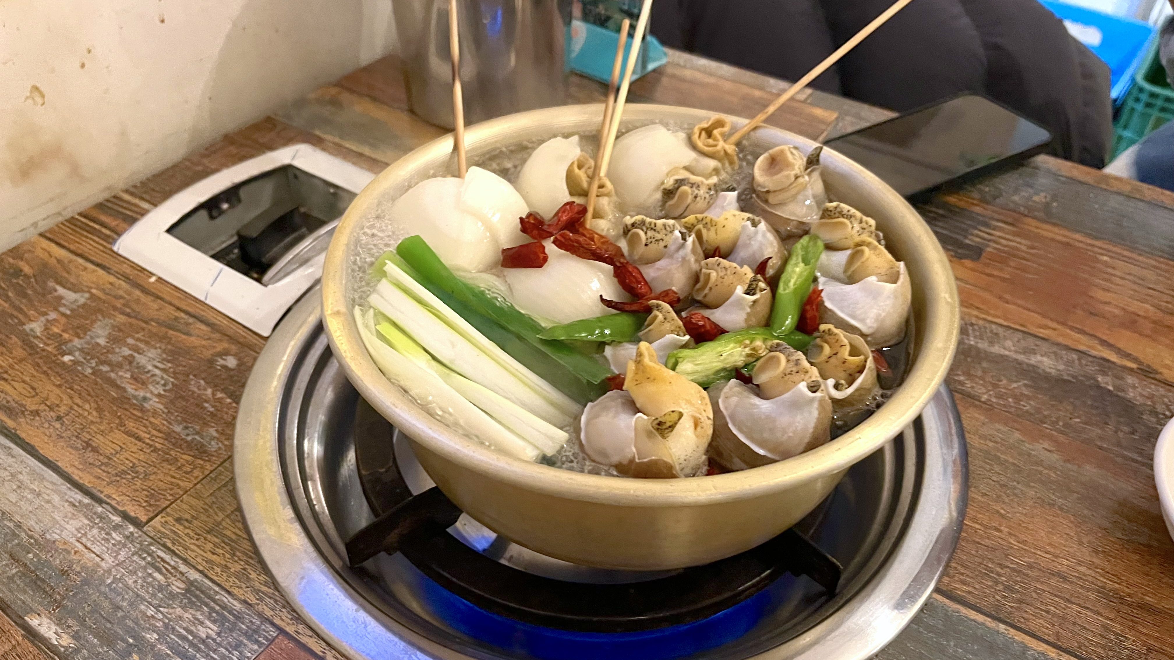 Coming to the last meal of my trip, we attempted a popular Korean seafood dish that puts fresh whelks into a pot of flavorsome stock cooked with seaweed, onions, skewers of fish cakes, and chili peppers that inject a spicy kick. Attached to the big spiral shells, the whelks have a supple, meaty texture, with a good balance of saltiness and sweetness. To enrich the tasting experience, top it with a sprinkle of bright orange flying fish roe before enveloping it with a sesame leaf and a crispy piece of seaweed. After finishing the ingredients in the pot, we also asked for some udon to go with the broth so we don’t waste anything.